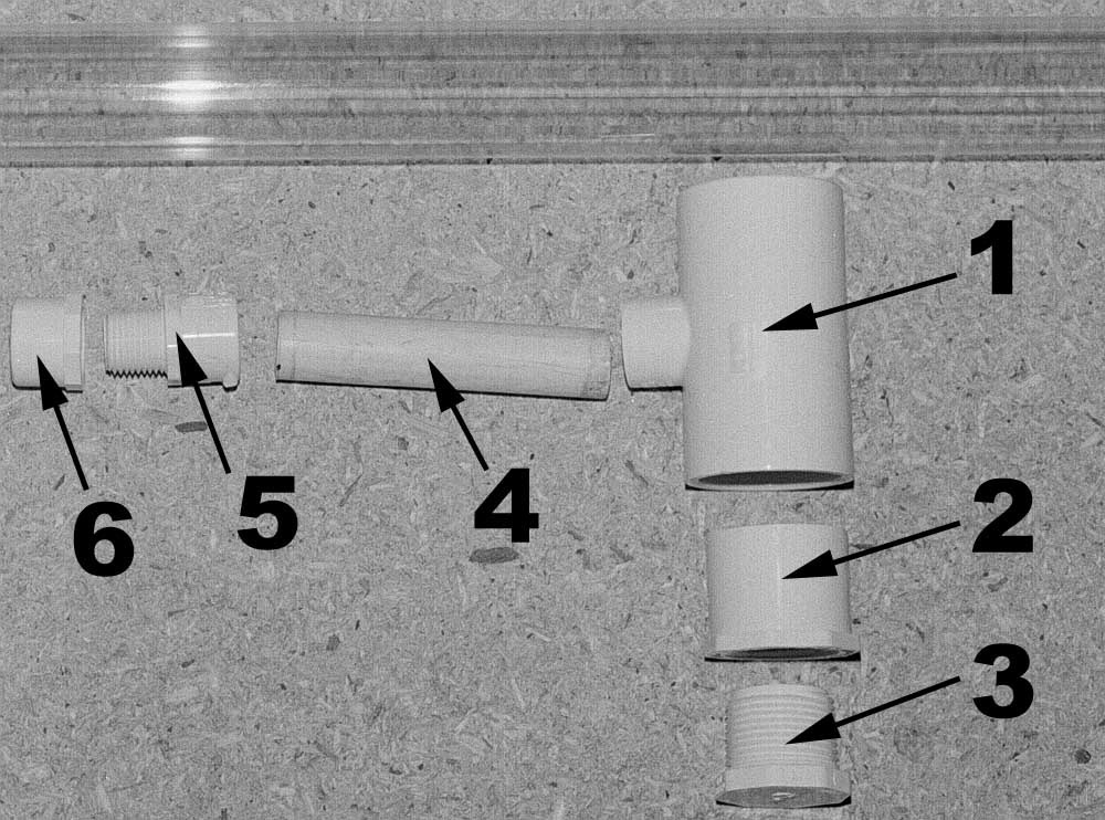 Put PVC cement on the 1/2" slip to 1/2" male thread fitting [# 5] and insert it fully onto the open end of the 1/2" pipe [# 4]. After the epoxy has hardened around the air tube for at least an hour, attach the check valve to the short length of tubing coming out of the pipe. The check valve must be connected so that the air can flow into the pipe. Airflow direction should be marked on the valve or its package.