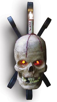 There seems to be nothing in a haunted house that seems to fascinate people more than when objects talk to them UNLESS it is one that interacts with them. A modified Talking Boris or even a Talk Thru Bones Jones could be made to speak with people as they walk by. We are NOT limited to a wrought iron mount for the skull. Using the Bones Jones, you can mount your skull sconce on a wall plaque as it is not a full head prop. The candle can be added for additional lighting for your visitors. An X10 camera or intercom system to this prop could be used to interact with visitors.