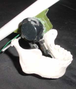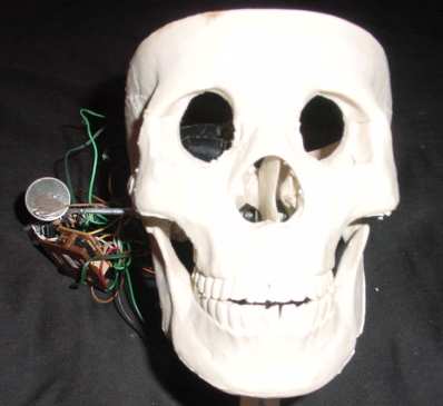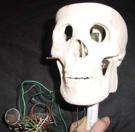 This is the jaw in the resting position of the motor. I was amazed at the abuse these little motors could take and still work afterwards. One very important tip when inserting the rod through the jaw and motor is that as soon as you have done this, please fit the jaw to the skull. One of the talking skulls could not be finished on saturday because the jaw was a little distorted and no longer fit in the socket of the skull. Not to worry....Uncle Clamp-It to the rescue. The skull was turned over and one jaw placed into its socket. A clamp was attached to the jaw bone and pressure applied until both joints fit into their respective spots. Unfortunately, Bucky has had to wear his new dental appliance for a short time until the jaw bone returns to normal. |